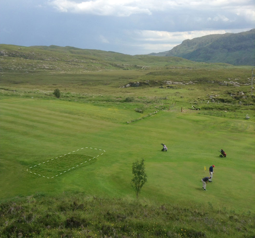 Traigh Golf Course – one of the most scenic in Scotland - is delighted to announce that the 12 foot deep sinkhole, which appeared overnight last November as a result of a collapsed drain in torrential storms, has now been fully repaired. The replacement turf is now well-established and a new grass bunker has been added next to the seventh green – albeit it is considerably smaller than the original sinkhole! The seventh hole is going to be formally reopened on Saturday 1st August, the day of the Traigh Open competition.